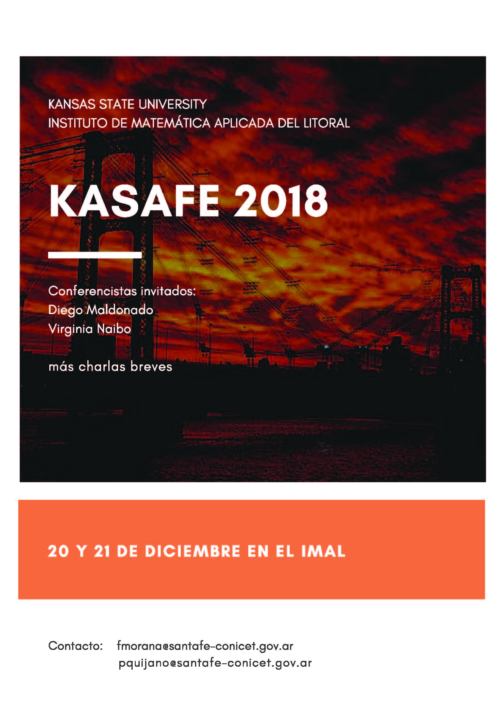 KASAFE es un congreso de análisis que este año se realizará los días 20 y 21 de diciembre en el IMAL. Este encuentro nace de la visita de dos investigadores vinculados desde hace mucho al grupo de análisis de Santa Fe que están actualmente en Kansas State University: Virginia Naibo y Diego Maldonado. Se realizarán dos conferencias a cargo de Virginia y Diego y también habrá varias charlas cortas dadas por tesistas y recientes doctores.